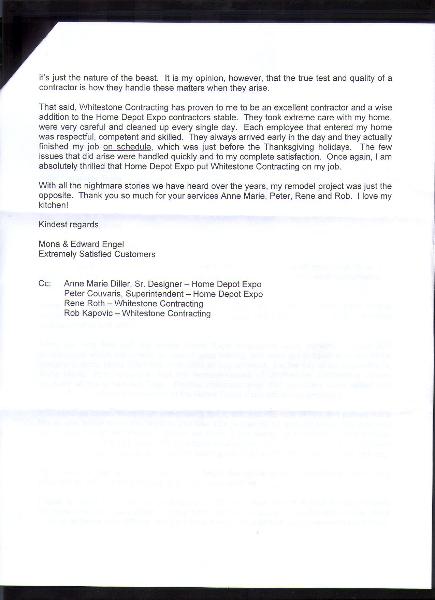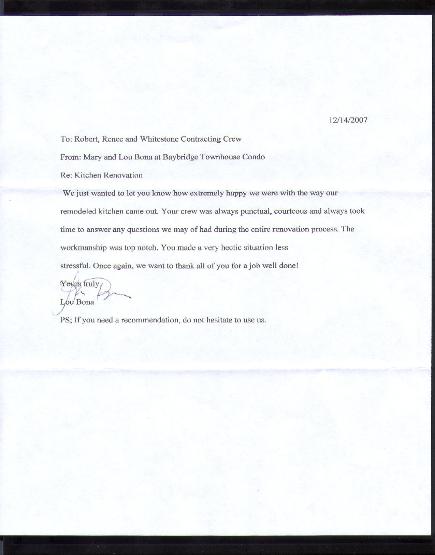 We knew that any renovation would be a daunting task but actually doing it and surviving it is quite a feat . Thank you for completing the project with us. Balancing the original design, the technical problems and the Co-op restrictions and most of all the estimated budget was quite a challenge and your cooperation and decisiveness and prompt response helped tremendously toward achieving our goal. The project was finished on time and the crew's behavior was professional. After completion your quick response to some unfinished business and minor details was most appreciated.